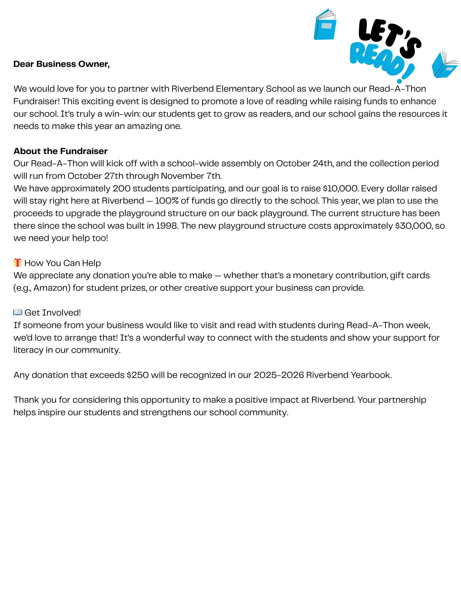 Title Let's Read; ear Business Owner, We would love for you to partner with Riverbend Elementary School as we launch our Read-A-Thon Fundraiser! This exciting event is designed to promote a love of reading while raising funds to enhance our school. It’s truly a win-win: our students get to grow as readers, and our school gains the resources it needs to make this year an amazing one. About the Fundraiser Our Read-A-Thon will kick off with a school-wide assembly on October 24th, and the collection period will run from October 27th through November 7th. We have approximately 200 students participating, and our goal is to raise $10,000. Every dollar raised will stay right here at Riverbend — 100% of funds go directly to the school. This year, we plan to use the proceeds to upgrade the playground structure on our back playground. The current structure has been there since the school was built in 1998. The new playground structure costs approximately $30,000, so we need your help too! 🎁 How You Can Help We appreciate any donation you’re able to make — whether that’s a monetary contribution, gift cards (e.g., Amazon) for student prizes, or other creative support your business can provide. 📖 Get Involved! If someone from your business would like to visit and read with students during Read-A-Thon week, we’d love to arrange that! It’s a wonderful way to connect with the students and show your support for literacy in our community. Any donation that exceeds $250 will be recognized in our 2025-2026 Riverbend Yearbook. Thank you for considering this opportunity to make a positive impact at Riverbend. Your partnership helps inspire our students and strengthens our school community.