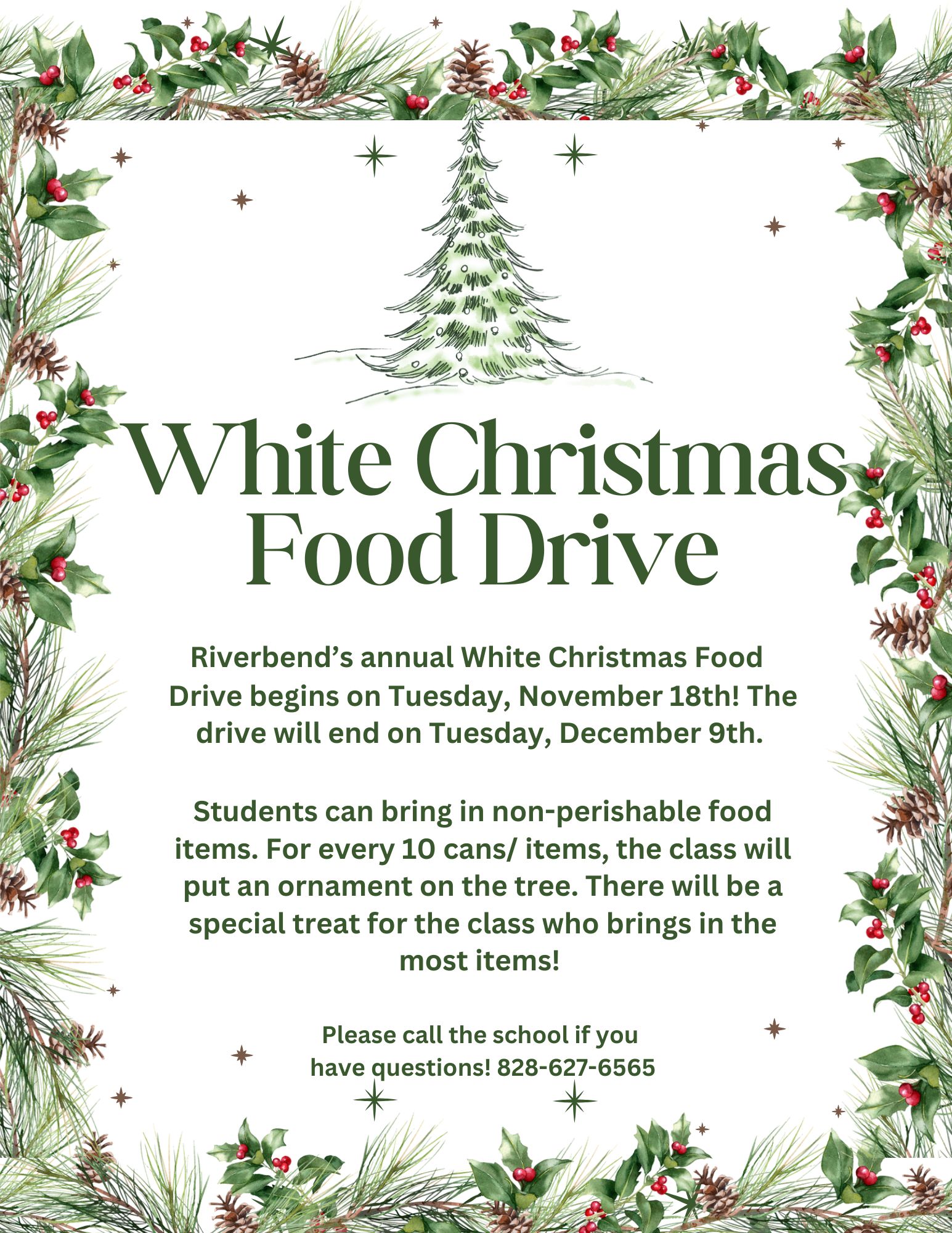 White Christmas Food Drive; Riverbend’s annual White Christmas Food; Drive begins on Tuesday, November 18th! The drive will end on Tuesday, December 9th. Students can bring in non-perishable food items. For every 10 cans/ items, the class will put an ornament on the tree. There will be a special treat for the class who brings in the most items! Please call the school if you have questions! 828-627-6565