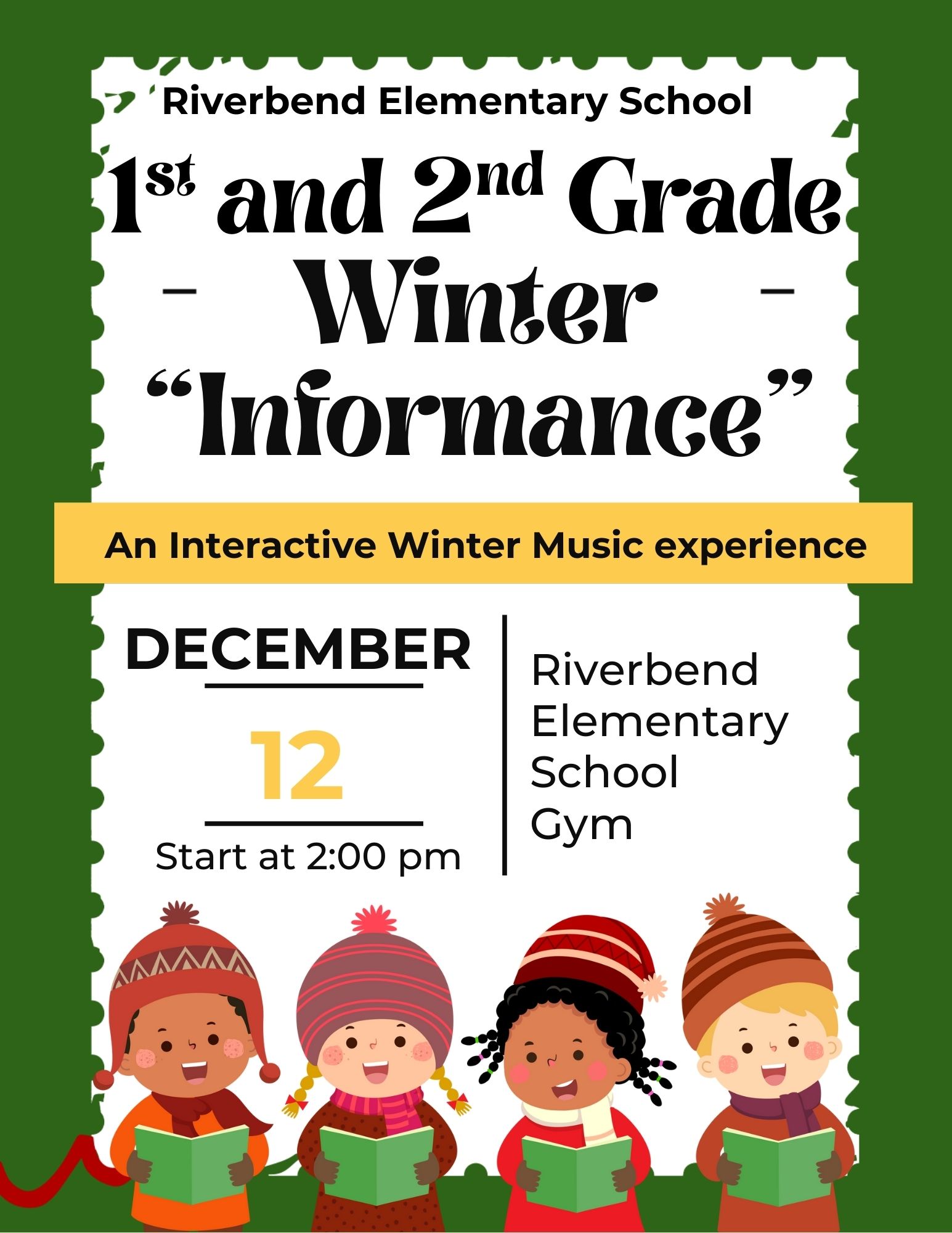 Riverbend Elementary School; 1st and 2nd Grade; Winter “Informance”; An Interactive Winter Music experience; December 12 starting at 2:00 pm; Riverbend Elementary School Gym